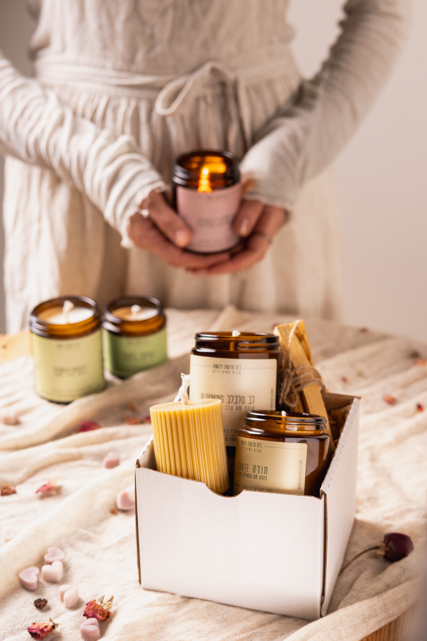 מארז מאיר וCooozy לאוהבי הניחוחות והנרות… 2 נרות טבעיים משעוות קוקוס וסויה בתוספת שמנים אתרים (אחד 120 מיל', אחד 200 ימל'), נר טבעי קטן משעוות דבורים בניחוח Tropical bloom (110 ג') , 2 מקלות פאלו סנטו לטיהור הבית.